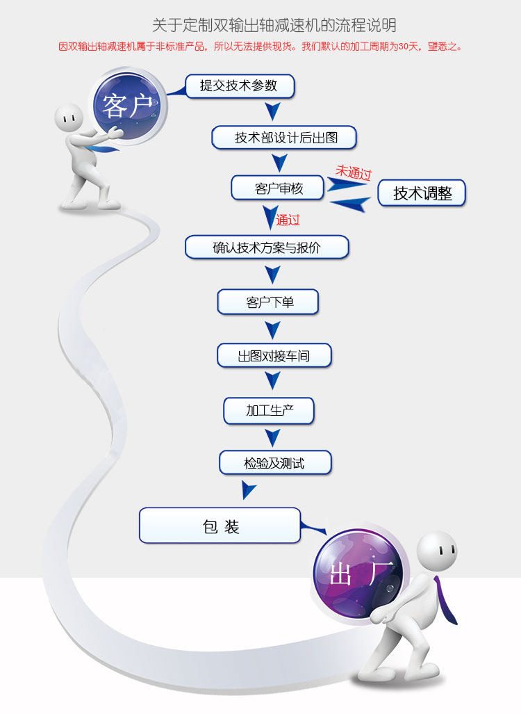 雙輸出軸減速機僅僅是非標準減速機中較有代表性的產品之一,在十多年的產品定制過程中,我們接觸了太多的非標減速機案例,比如6軸、8軸、甚至還有14軸的多軸減速機。其實,我們關心的不是您的設備需要幾根輸出軸,我們關心的是,您的技術參數(shù)是否準確并完整。只要技術參數(shù)到位了,正常情況下,我們都可以給出佳的技術方案。